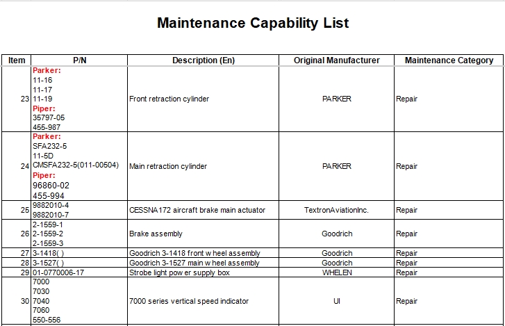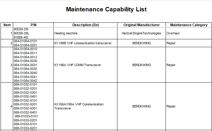 Это наш список возможностей технического обслуживания, который включает более 1000 номеров деталей, которые могут быть протестированы, отремонтированы или отремонтированы, и могут обслуживать OEM, таких как Hartzell, BK и Garmin.